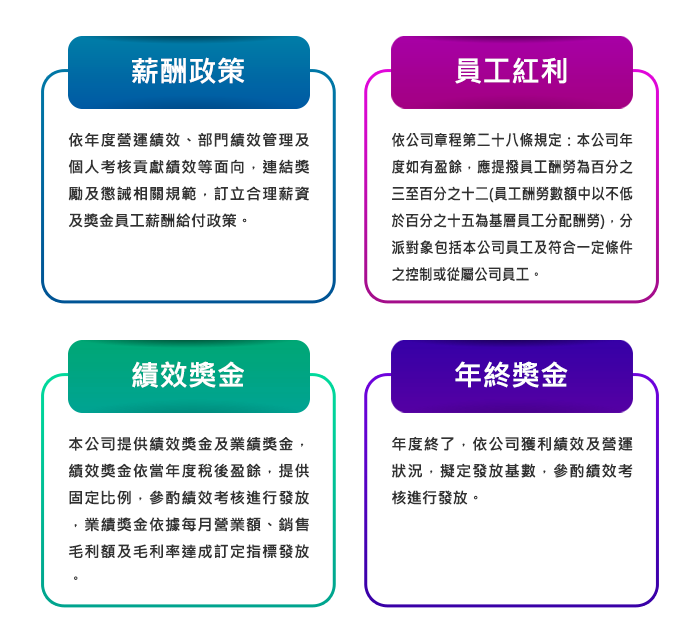 本公司參照薪資市場概況、公司財務情形、組織結構,訂定員工薪資給付標準,並依據員工個別專業職能、相關工作職掌、績效表現及公司營運績效,決定總體薪酬,所有同仁薪資不因性別、種族、黨籍、思想、宗教、性別傾向或婚姻狀況而有所差異,並符合政府基本工資規定,其他相關紅利、績效及年終獎金辦法說明如下: |